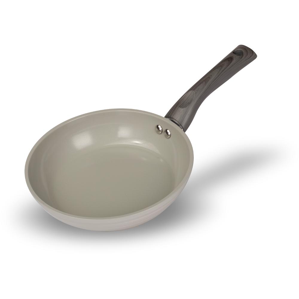 Изготовлено из сверхпрочного алюминия. Сковорода имеет внутреннюю поверхность, устойчивую к истиранию и пригоранию, а также толстое основание и элегантную мягкую ручку. Керамический материал очень термостойкий, предотвращает запекание пищи, здоровое приготовление пищи. Простота в обслуживании и очистке.