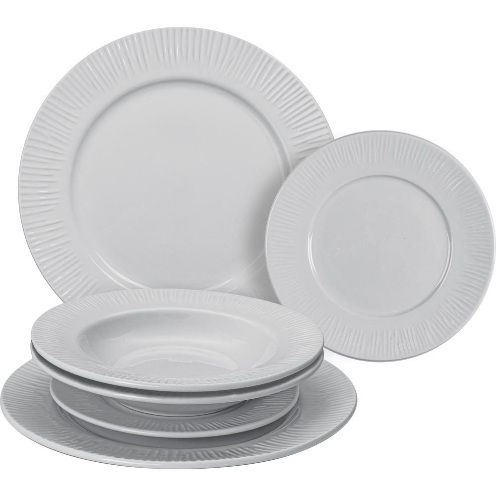 Набор обеденных тарелок включает 2 тарелки, 2 глубоких тарелки и 2 тарелки для десерта.