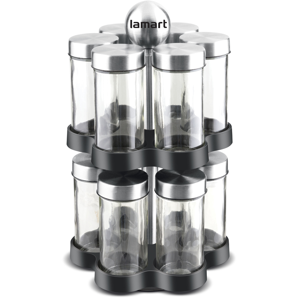 Набор из банок для приправ на вращающейся стойке с современным дизайном.