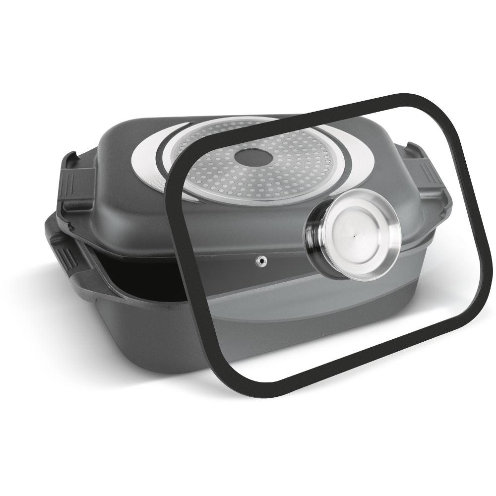 Кассероль из высококачественного литого алюминия с крышкой из боросиликатного стекла и крышкой для запекания с внутренним противопригарным покрытием и толстым основанием.