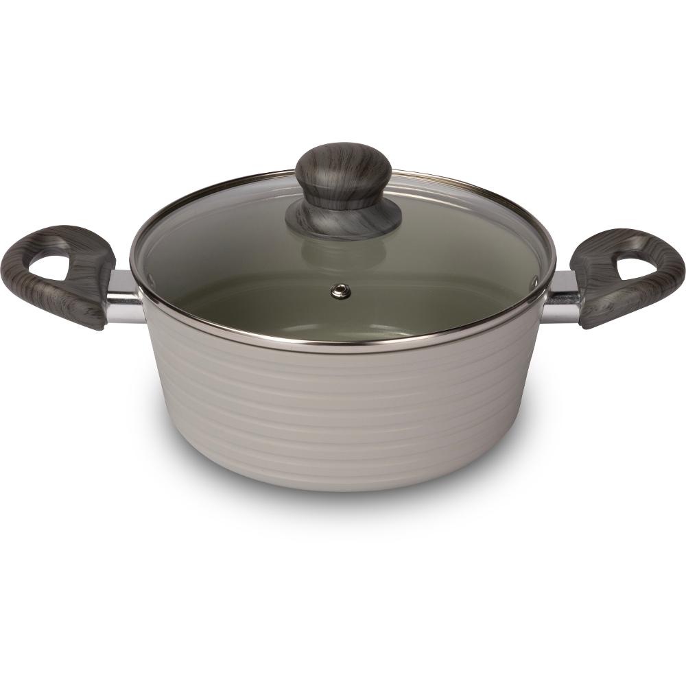 Изготовлена из высокопрочного алюминия. Посуда оснащена керамической поверхностью, устойчивой к царапинам и пригоранию, толстым дном с очень элегантными ручками для большей безопасности, функциональности и комфорта. Крышка из прочного стекла и пароотвод для точного контроля приготовления. Керамический материал очень устойчив к высоким температурам, не позволяет пище запекаться, обеспечивая здоровое приготовление. Простой уход и чистка.